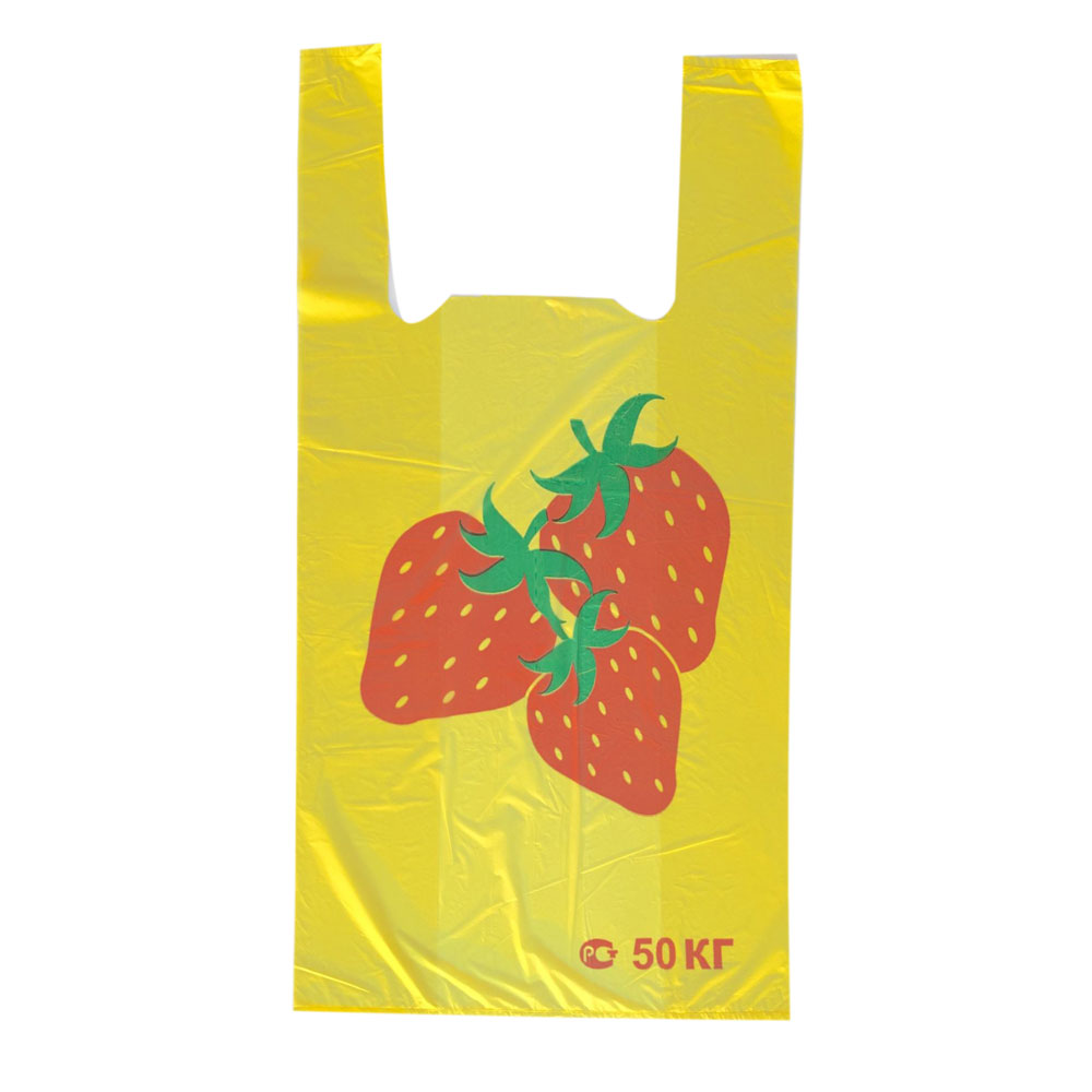 Ярко-желтые пакеты-майки ПНД 30+16х55=25 с дизайном «Клубничка» выполнены из полиэтилена низкого давления, что гарантирует их прочность и долговечность. Эти пакеты удобны в применении, устойчивы к разрывам и подходят для фасовки широкого ассортимента товаров — хлеба, выпечки, десертов, фруктов и овощей.